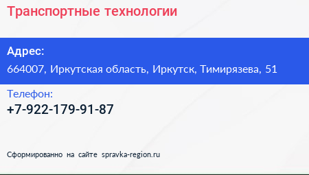 Транспортные технологии по адресу 664007, Иркутская область, Иркутск, Тимирязева, 51 в дальнейшем Организация, размещена в следующих категориях: