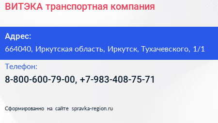 ВИТЭКА, транспортная компания по адресу 664040, Иркутская область, Иркутск, Тухачевского, 1/1 в дальнейшем Организация, размещена в следующих категориях: