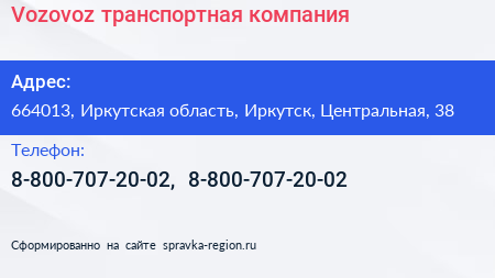Vozovoz, транспортная компания по адресу 664013, Иркутская область, Иркутск, Центральная, 38 в дальнейшем Организация, размещена в следующих категориях: