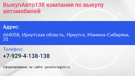 ВыкупАвто138, компания по выкупу автомобилей по адресу 664058, Иркутская область, Иркутск, Мамина-Сибиряка, 31 в дальнейшем Организация, размещена в следующих категориях: