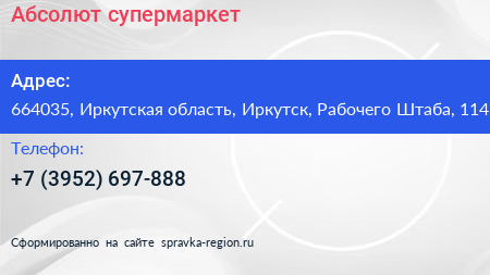 Абсолют, супермаркет по адресу 664035, Иркутская область, Иркутск, Рабочего Штаба, 114 в дальнейшем Организация, размещена в следующих категориях: