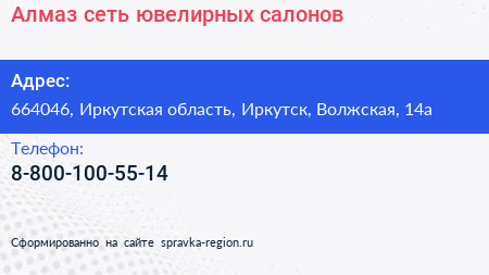 Алмаз, сеть ювелирных салонов по адресу 664046, Иркутская область, Иркутск, Волжская, 14а в дальнейшем Организация, размещена в следующих категориях: