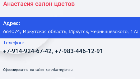 Анастасия, салон цветов по адресу 664074, Иркутская область, Иркутск, Чернышевского, 17а в дальнейшем Организация, размещена в следующих категориях: