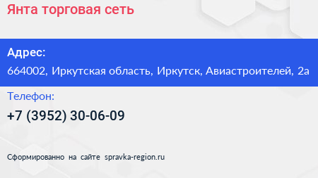Янта, торговая сеть по адресу 664002, Иркутская область, Иркутск, Авиастроителей, 2а в дальнейшем Организация, размещена в следующих категориях: