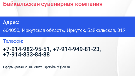 Байкальская сувенирная компания по адресу 664050, Иркутская область, Иркутск, Байкальская, 319 в дальнейшем Организация, размещена в следующих категориях: