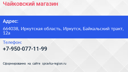 Чайковский, магазин по адресу 664038, Иркутская область, Иркутск, Байкальский тракт, 12а в дальнейшем Организация, размещена в следующих категориях: