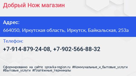 Добрый Нож, магазин по адресу 664050, Иркутская область, Иркутск, Байкальская, 253а в дальнейшем Организация, размещена в следующих категориях: