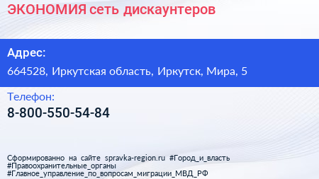 ЭКОНОМИЯ, сеть дискаунтеров по адресу 664528, Иркутская область, Иркутск, Мира, 5 в дальнейшем Организация, размещена в следующих категориях: