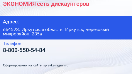 ЭКОНОМИЯ, сеть дискаунтеров по адресу 664523, Иркутская область, Иркутск, Берёзовый микрорайон, 235а в дальнейшем Организация, размещена в следующих категориях: