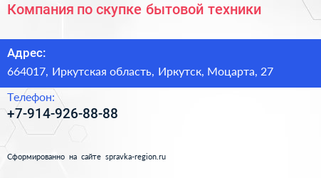 Компания по скупке бытовой техники по адресу 664017, Иркутская область, Иркутск, Моцарта, 27 в дальнейшем Организация, размещена в следующих категориях: