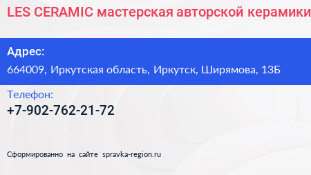 LES CERAMIC, мастерская авторской керамики по адресу 664009, Иркутская область, Иркутск, Ширямова, 13Б в дальнейшем Организация, размещена в следующих категориях: