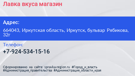 Лавка вкуса, магазин по адресу 664043, Иркутская область, Иркутск, бульвар Рябикова, 32г в дальнейшем Организация, размещена в следующих категориях:
