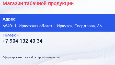 Магазин табачной продукции по адресу 664011, Иркутская область, Иркутск, Свердлова, 36 в дальнейшем Организация, размещена в следующих категориях: