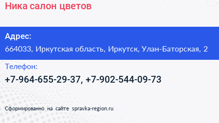 Ника, салон цветов по адресу 664033, Иркутская область, Иркутск, Улан-Баторская, 2 в дальнейшем Организация, размещена в следующих категориях: