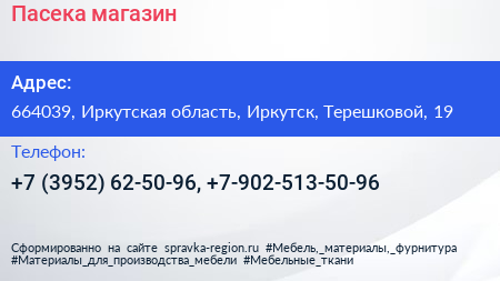 Пасека, магазин по адресу 664039, Иркутская область, Иркутск, Терешковой, 19 в дальнейшем Организация, размещена в следующих категориях: