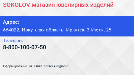 SOKOLOV, магазин ювелирных изделий по адресу 664022, Иркутская область, Иркутск, 3 Июля, 25 в дальнейшем Организация, размещена в следующих категориях: