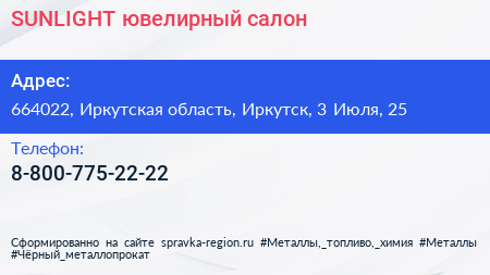 SUNLIGHT, ювелирный салон по адресу 664022, Иркутская область, Иркутск, 3 Июля, 25 в дальнейшем Организация, размещена в следующих категориях: