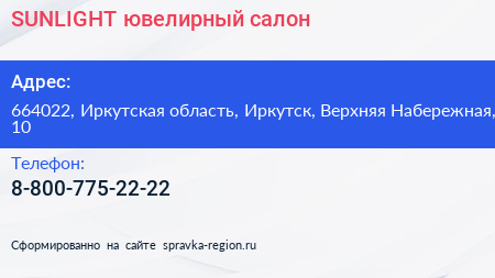 SUNLIGHT, ювелирный салон по адресу 664022, Иркутская область, Иркутск, Верхняя Набережная, 10 в дальнейшем Организация, размещена в следующих категориях:
