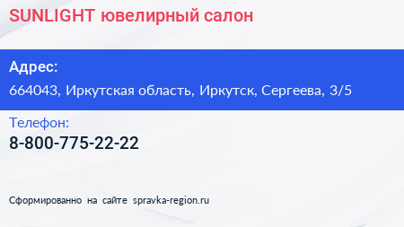 SUNLIGHT, ювелирный салон по адресу 664043, Иркутская область, Иркутск, Сергеева, 3/5 в дальнейшем Организация, размещена в следующих категориях: