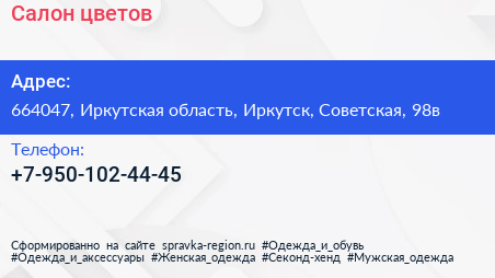 Салон цветов по адресу 664047, Иркутская область, Иркутск, Советская, 98в в дальнейшем Организация, размещена в следующих категориях:
