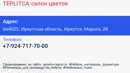 TEPLITCA, салон цветов по адресу 664025, Иркутская область, Иркутск, Марата, 28 в дальнейшем Организация, размещена в следующих категориях: