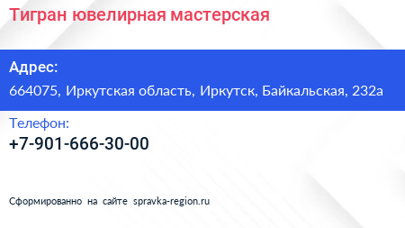Тигран, ювелирная мастерская по адресу 664075, Иркутская область, Иркутск, Байкальская, 232а в дальнейшем Организация, размещена в следующих категориях: