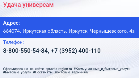 Удача, универсам по адресу 664074, Иркутская область, Иркутск, Чернышевского, 4а в дальнейшем Организация, размещена в следующих категориях: