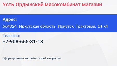 Усть-Ордынский мясокомбинат, магазин по адресу 664024, Иркутская область, Иркутск, Трактовая, 14 к4 в дальнейшем Организация, размещена в следующих категориях: