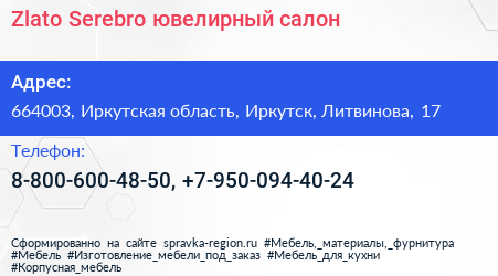 Zlato & Serebro, ювелирный салон по адресу 664003, Иркутская область, Иркутск, Литвинова, 17 в дальнейшем Организация, размещена в следующих категориях: