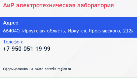 АиР, электротехническая лаборатория по адресу 664040, Иркутская область, Иркутск, Ярославского, 212а в дальнейшем Организация, размещена в следующих категориях: