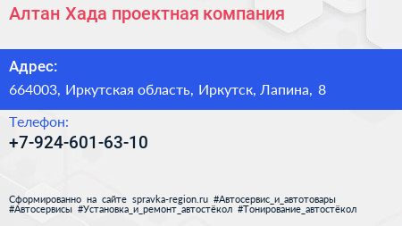 Алтан-Хада, проектная компания по адресу 664003, Иркутская область, Иркутск, Лапина, 8 в дальнейшем Организация, размещена в следующих категориях: