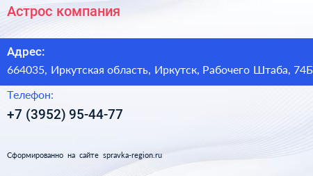 Астрос, компания по адресу 664035, Иркутская область, Иркутск, Рабочего Штаба, 74Б в дальнейшем Организация, размещена в следующих категориях: