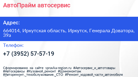 АвтоПрайм, автосервис по адресу 664014, Иркутская область, Иркутск, Генерала Доватора, 39а в дальнейшем Организация, размещена в следующих категориях: