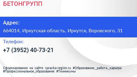 БЕТОНГРУПП по адресу 664014, Иркутская область, Иркутск, Воровского, 31 в дальнейшем Организация, размещена в следующих категориях: