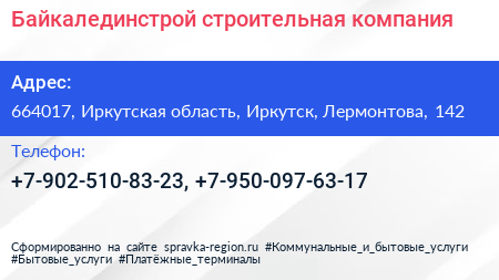 Байкалединстрой, строительная компания по адресу 664017, Иркутская область, Иркутск, Лермонтова, 142 в дальнейшем Организация, размещена в следующих категориях: