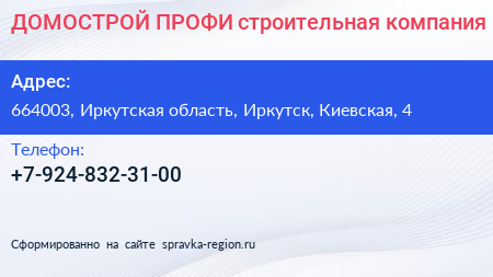 ДОМОСТРОЙ ПРОФИ, строительная компания по адресу 664003, Иркутская область, Иркутск, Киевская, 4 в дальнейшем Организация, размещена в следующих категориях: