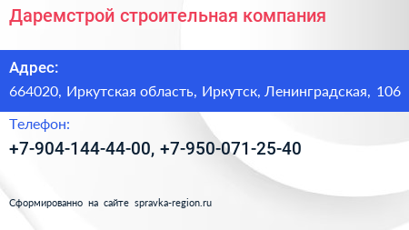 Даремстрой, строительная компания по адресу 664020, Иркутская область, Иркутск, Ленинградская, 106 в дальнейшем Организация, размещена в следующих категориях: