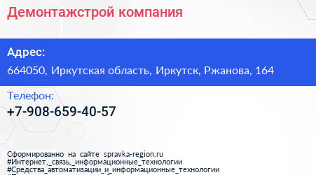 Демонтажстрой, компания по адресу 664050, Иркутская область, Иркутск, Ржанова, 164 в дальнейшем Организация, размещена в следующих категориях: