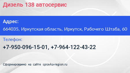 Дизель 138, автосервис по адресу 664035, Иркутская область, Иркутск, Рабочего Штаба, 60 в дальнейшем Организация, размещена в следующих категориях: