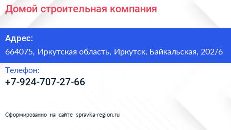 Домой, строительная компания по адресу 664075, Иркутская область, Иркутск, Байкальская, 202/6 в дальнейшем Организация, размещена в следующих категориях:
