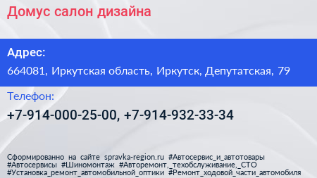 Домус, салон дизайна по адресу 664081, Иркутская область, Иркутск, Депутатская, 79 в дальнейшем Организация, размещена в следующих категориях: