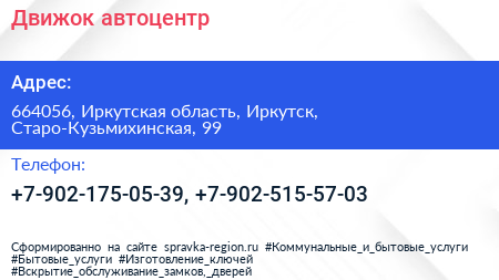 Движок, автоцентр по адресу 664056, Иркутская область, Иркутск, Старо-Кузьмихинская, 99 в дальнейшем Организация, размещена в следующих категориях: