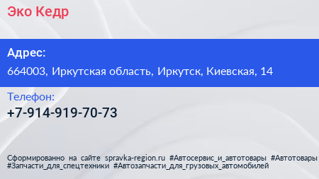 Эко Кедр по адресу 664003, Иркутская область, Иркутск, Киевская, 14 в дальнейшем Организация, размещена в следующих категориях: