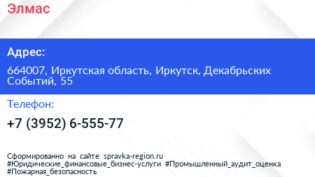 Элмас по адресу 664007, Иркутская область, Иркутск, Декабрьских Событий, 55 в дальнейшем Организация, размещена в следующих категориях: