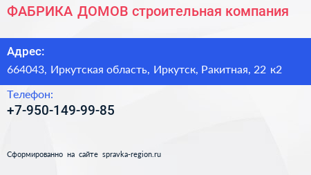 ФАБРИКА ДОМОВ, строительная компания по адресу 664043, Иркутская область, Иркутск, Ракитная, 22 к2 в дальнейшем Организация, размещена в следующих категориях: