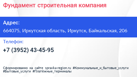 Фундамент, строительная компания по адресу 664075, Иркутская область, Иркутск, Байкальская, 206 в дальнейшем Организация, размещена в следующих категориях: