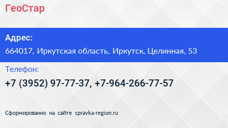 ГеоСтар по адресу 664017, Иркутская область, Иркутск, Целинная, 53 в дальнейшем Организация, размещена в следующих категориях: