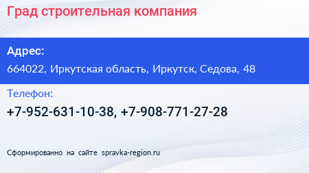 Град, строительная компания по адресу 664022, Иркутская область, Иркутск, Седова, 48 в дальнейшем Организация, размещена в следующих категориях: