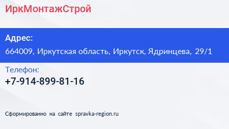 ИркМонтажСтрой по адресу 664009, Иркутская область, Иркутск, Ядринцева, 29/1 в дальнейшем Организация, размещена в следующих категориях: