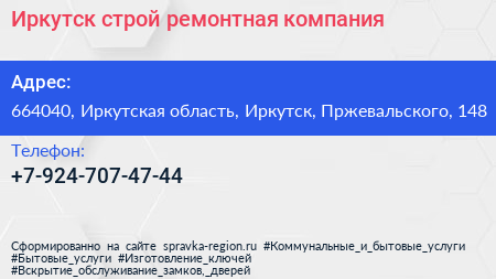 Иркутск-строй, ремонтная компания по адресу 664040, Иркутская область, Иркутск, Пржевальского, 148 в дальнейшем Организация, размещена в следующих категориях: